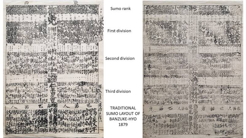 It is remarkable that the same 19th century layout of Sumo ranking charts is still being used to announce Sumo Basho.