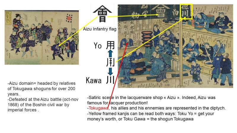 The Aizu domain was involved during this civil war to such an extent that it was directly represented in several of the numerous satirical diptych prints produced anonymously during the war.