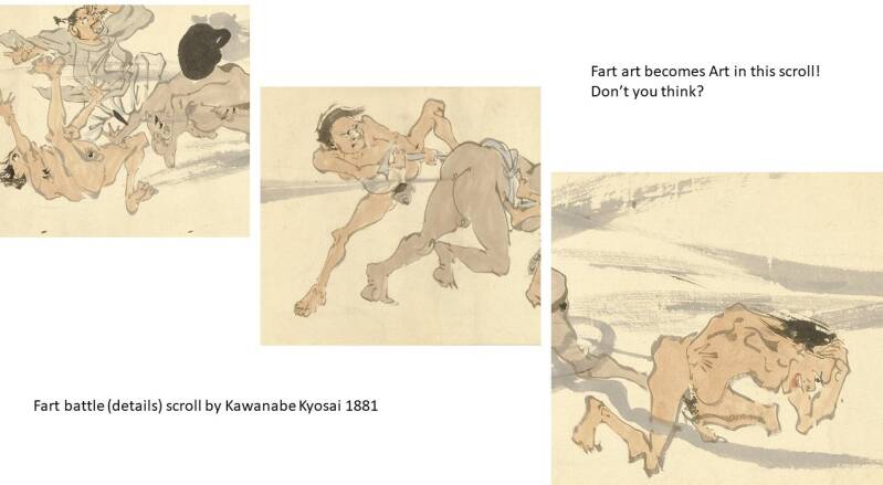 This 34 feet anonymous long scroll He-gassen (ca 1846) may be the best known of all Japanese fart artwork. It is funny but not without artistic research in the various scenes, like the crossfiring of the two women below.