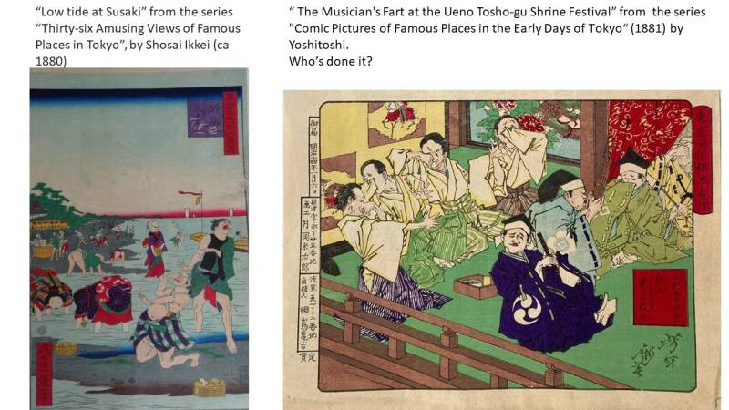 Although farting was not a major topic in Edo and Meiji periods woodblocks, some reknown artists produced prints on this theme.