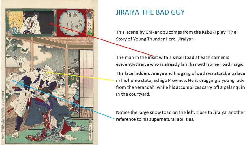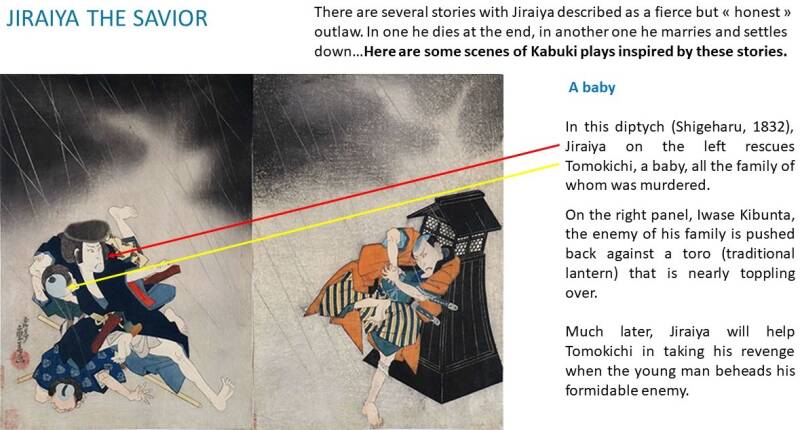 It is the first one of several plays on the exploits of the “honest” bandit Jiraiya and his gang of outlaws who robbed the wealthy and gave back to the poor and who inspired many woodblock prints in the 19th century.