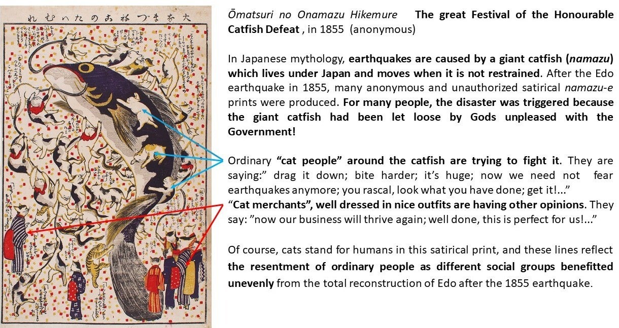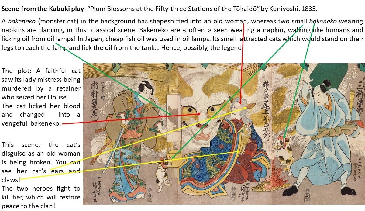 Cats are mysterious, cuddly and wild, and came as outlanders to Japan. Then, it is not a surprise they provoked at the same time attraction and fear, love and repulsion. Indeed, they became pets, but were also humanized and even transformed into demons! This post only describes a tiny part of the abundant production of prints showing this feline, but we did try to cover all main facets of cat’s sociology (!) that woodblock artists explored during the 19th century.
