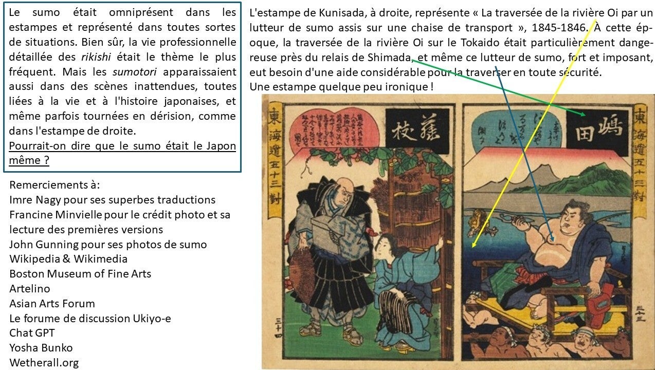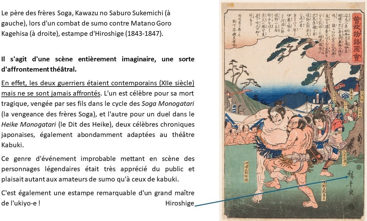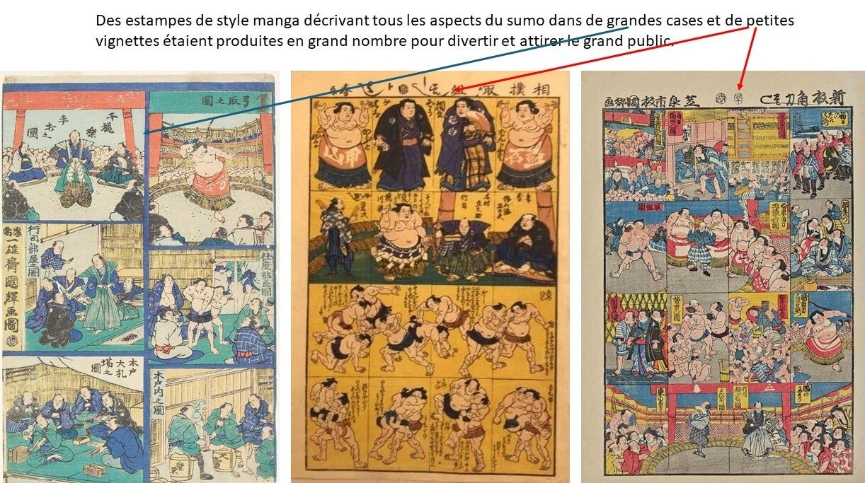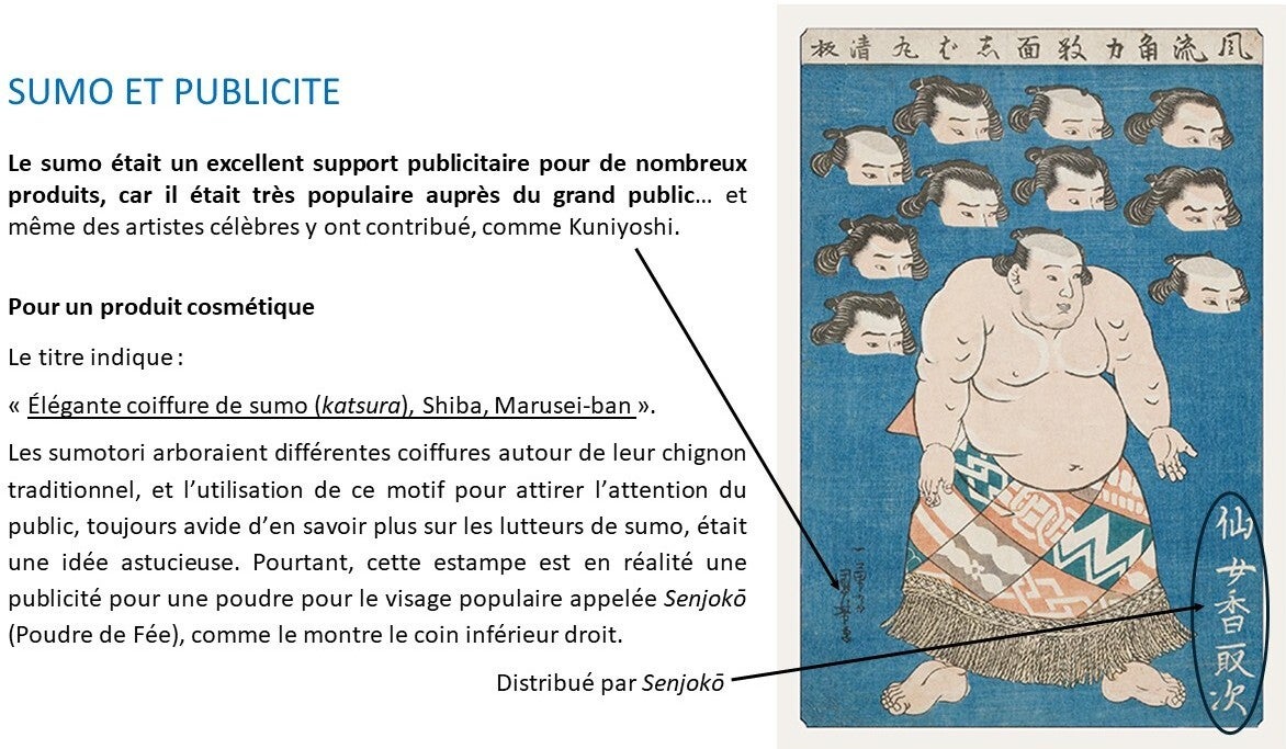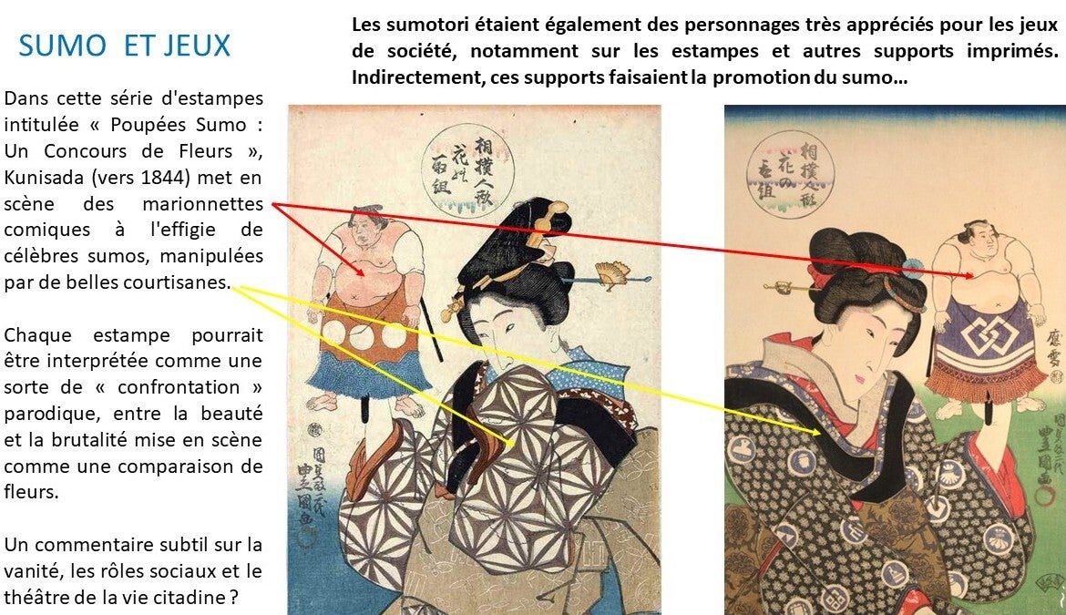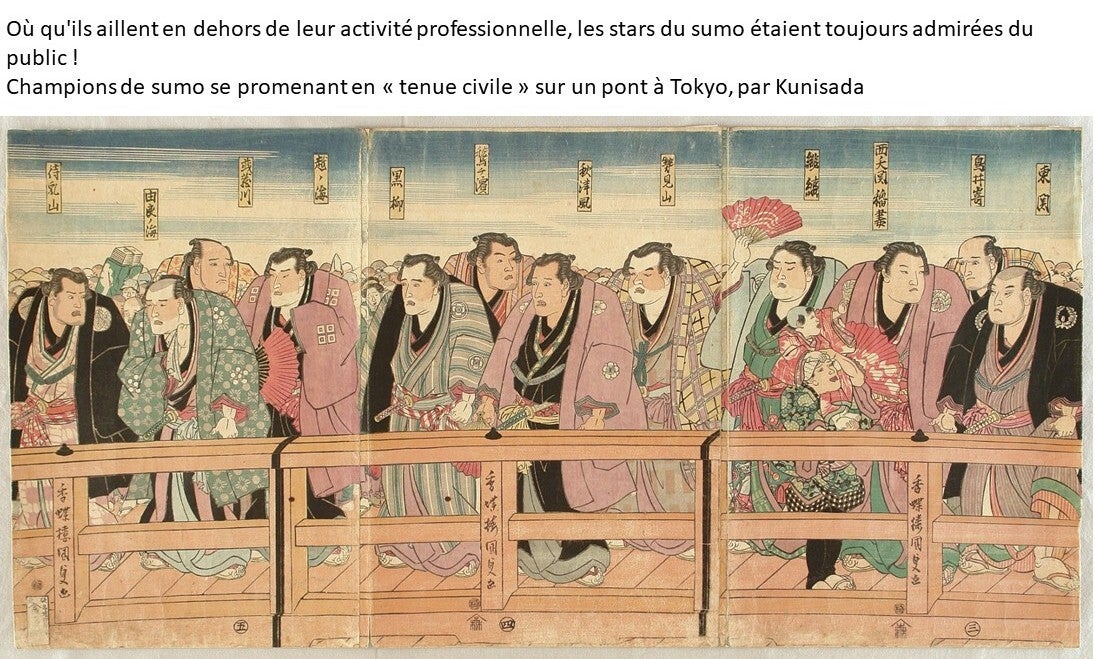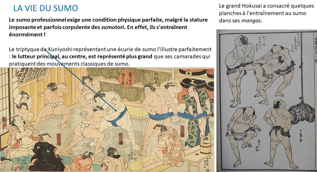 Mais au-delà de l'affrontement apparemment brutal entre ces imposants lutteurs (rikishi), le sumo est empreint de sophistication et même de recherche artistique… Les artistes d'ukiyo-e ont su représenter avec brio toutes les facettes du sumo, de l'entraînement aux tournois, avec réalisme, humour et un sens aigu du commerce, pour un public de tous âges et de tous sexes… car les femmes aussi appréciaient beaucoup les rikishi !