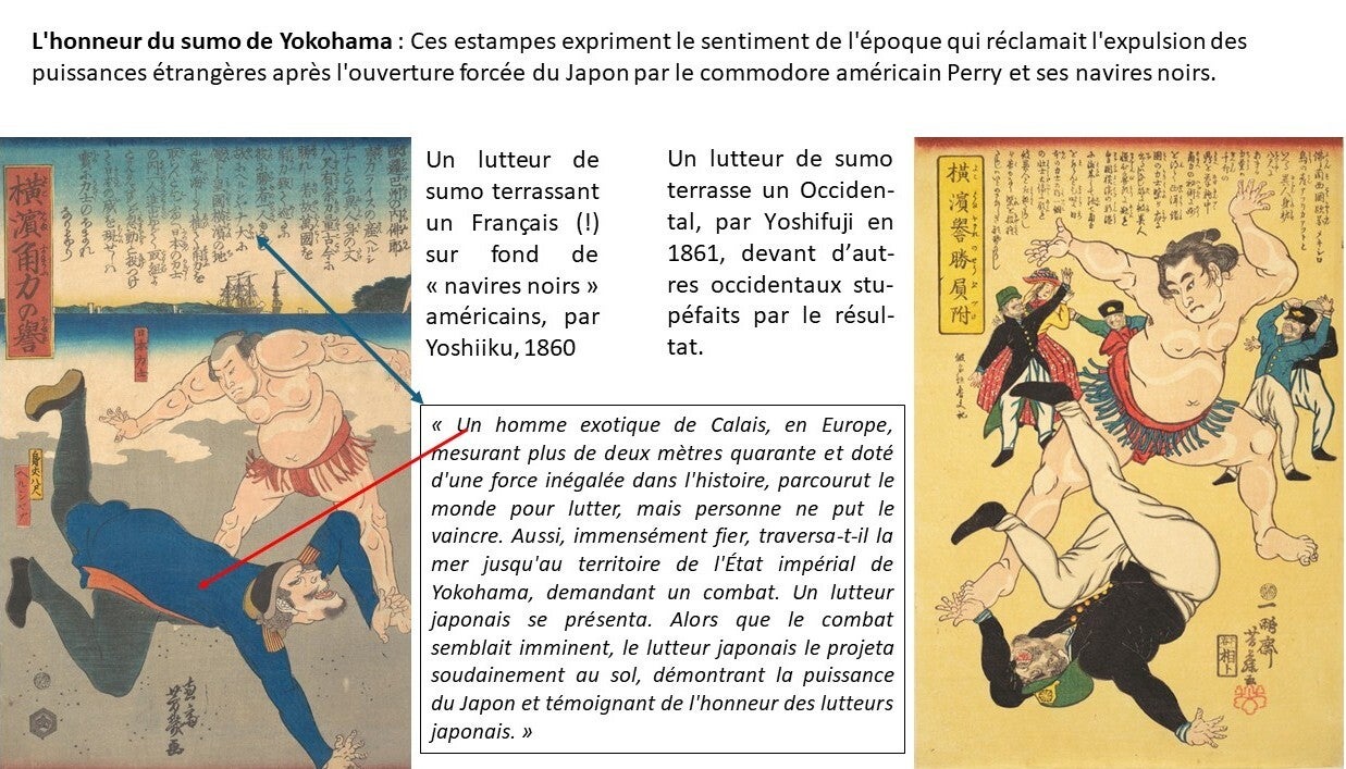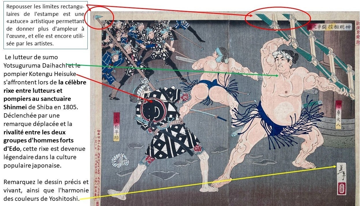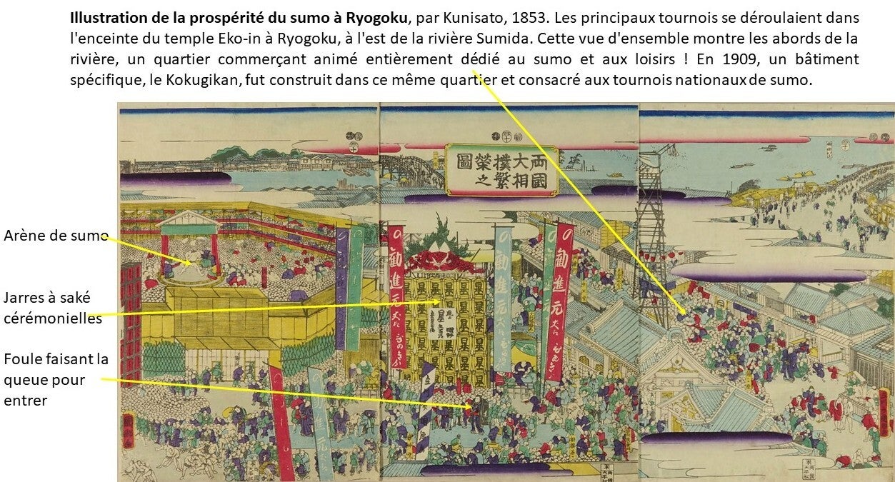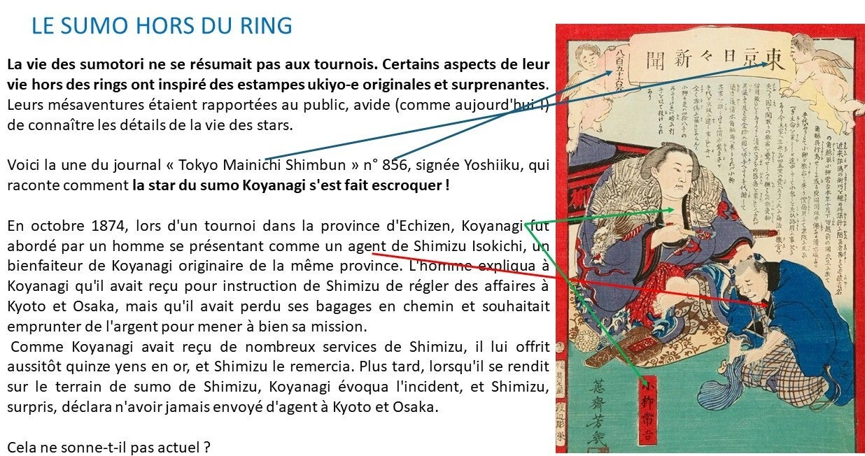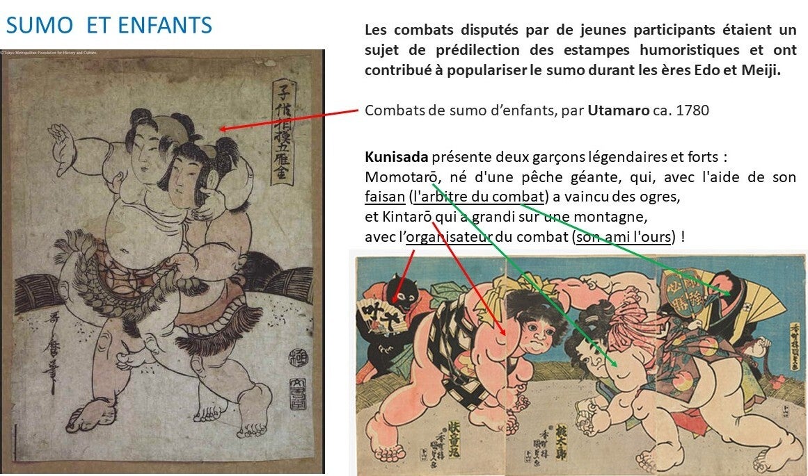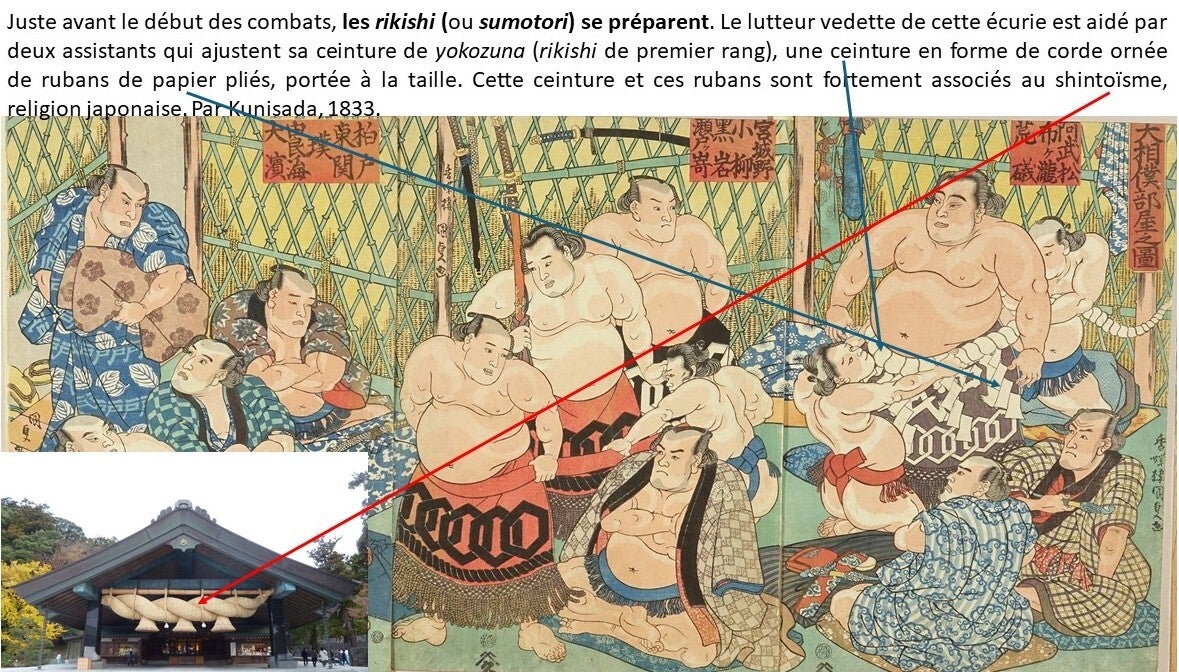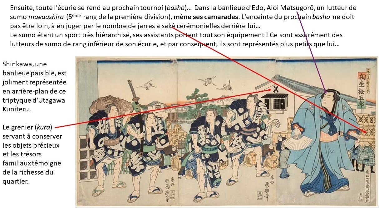 Mais au-delà de l'affrontement apparemment brutal entre ces imposants lutteurs (rikishi), le sumo est empreint de sophistication et même de recherche artistique… Les artistes d'ukiyo-e ont su représenter avec brio toutes les facettes du sumo, de l'entraînement aux tournois, avec réalisme, humour et un sens aigu du commerce, pour un public de tous âges et de tous sexes… car les femmes aussi appréciaient beaucoup les rikishi !