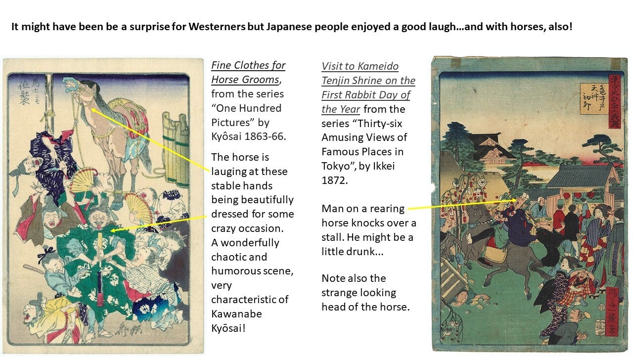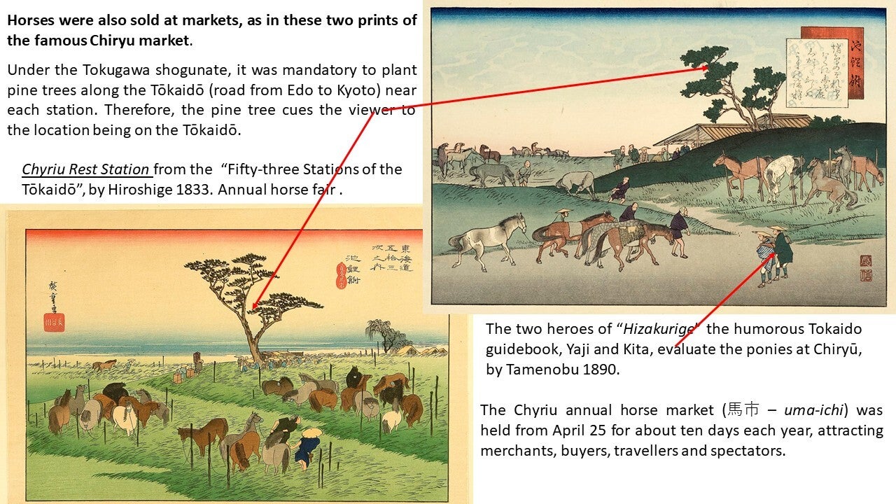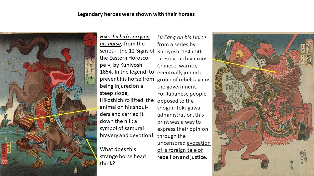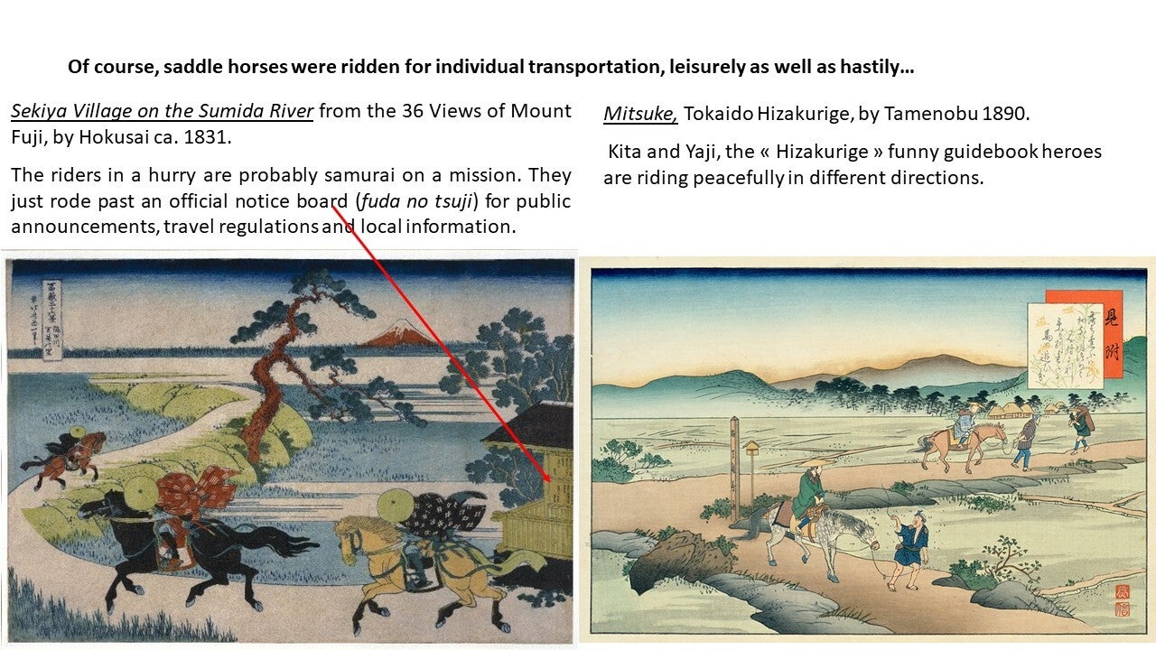 Like in Europe at the same period, the 19th century in Japan saw the climax of Equine presence in all avenues of Society: from Agriculture, Transportation and Military, to Amusement, and it shows in the variety of woodblock prints that were produced. In this post, you may have noticed horses were overwhelmingly present in the Tokaido series, as the carriers of people and goods.