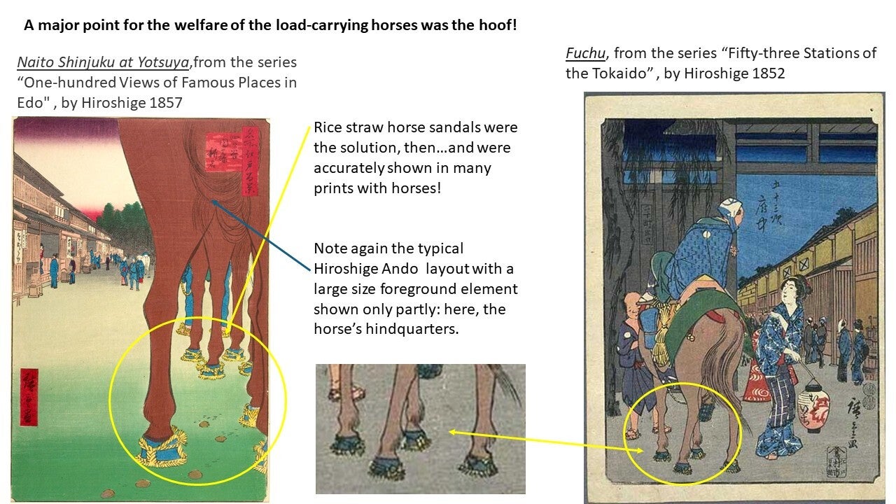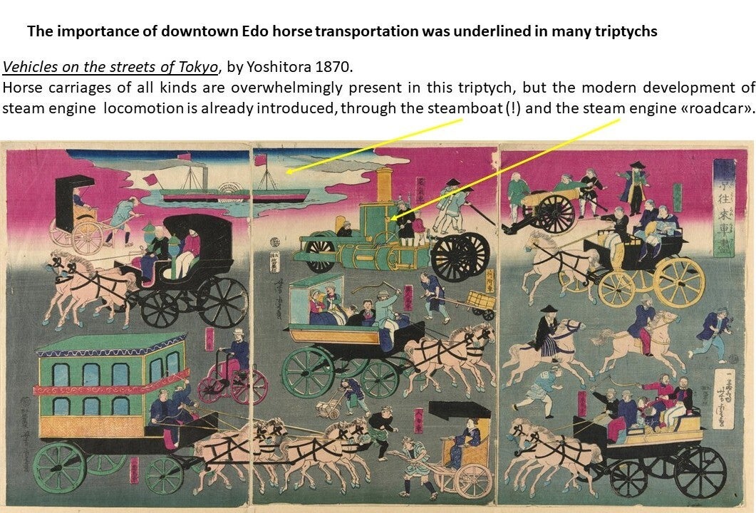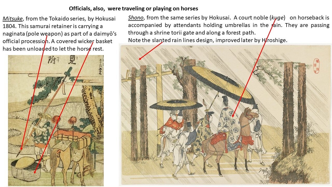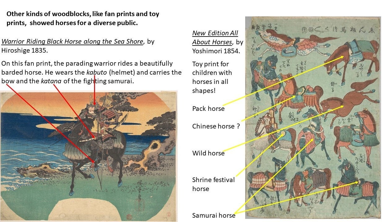 Like in Europe at the same period, the 19th century in Japan saw the climax of Equine presence in all avenues of Society: from Agriculture, Transportation and Military, to Amusement, and it shows in the variety of woodblock prints that were produced. In this post, you may have noticed horses were overwhelmingly present in the Tokaido series, as the carriers of people and goods.