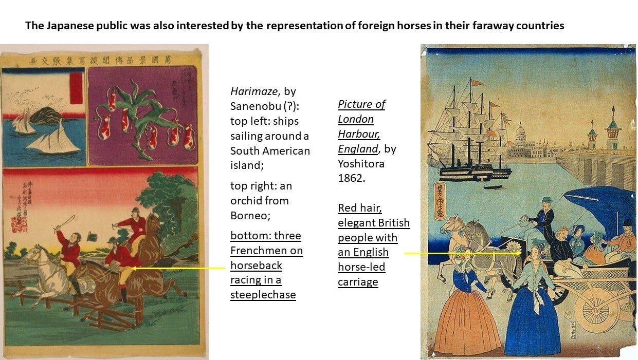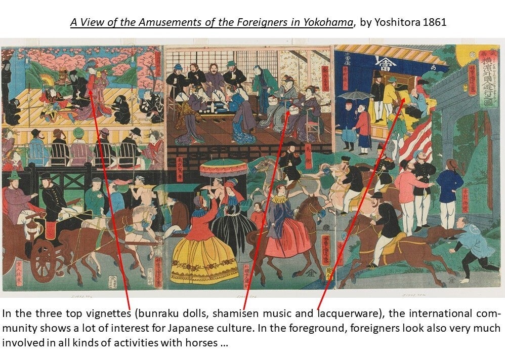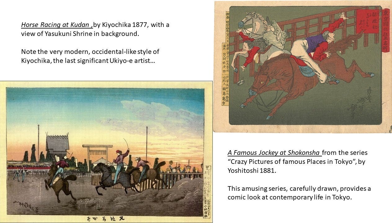 Horses have been present in Japan as early as in the 5th century. They came from Korea and China, and were quickly adopted in the country. For over one thousand years they were ridden by samurai and this introduction revolutionized warfare. But horses were also instrumental in reshaping political structures and influencing cultural and agricultural traditions. Therefore, it should not be a surprise if they are very present in all kinds of woodblock prints. Following the Meiji revolution in 1868 and the end of the « samurai society », there are no samurai horses now in Japan. But, as you will discover in this post, another horse activity took over.