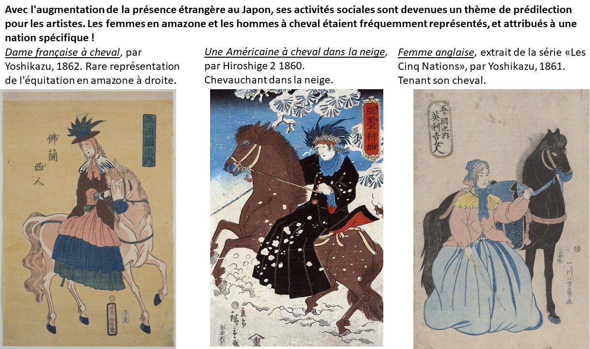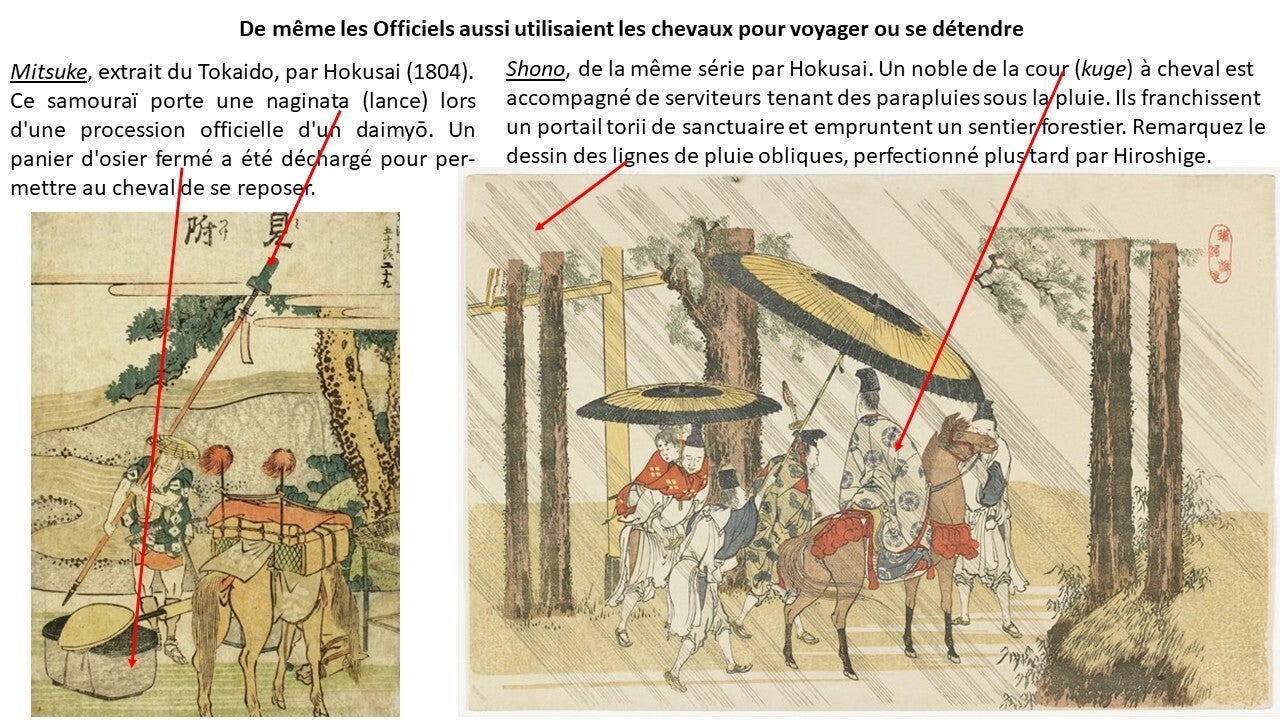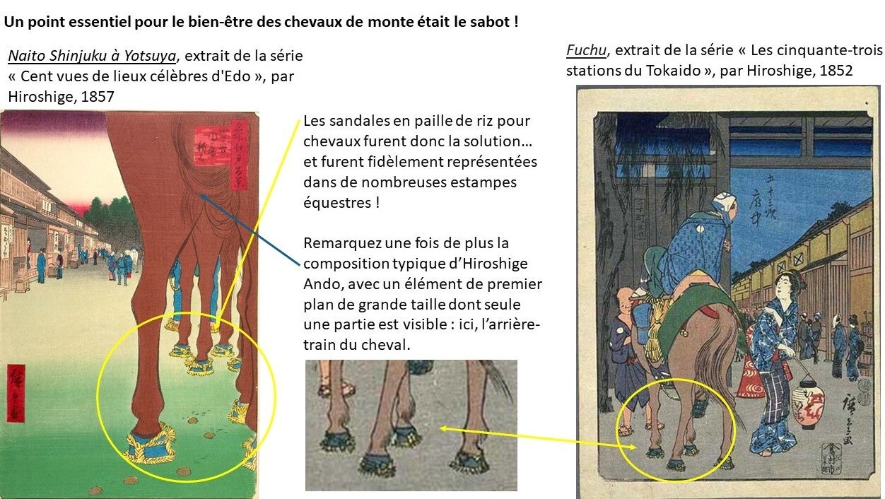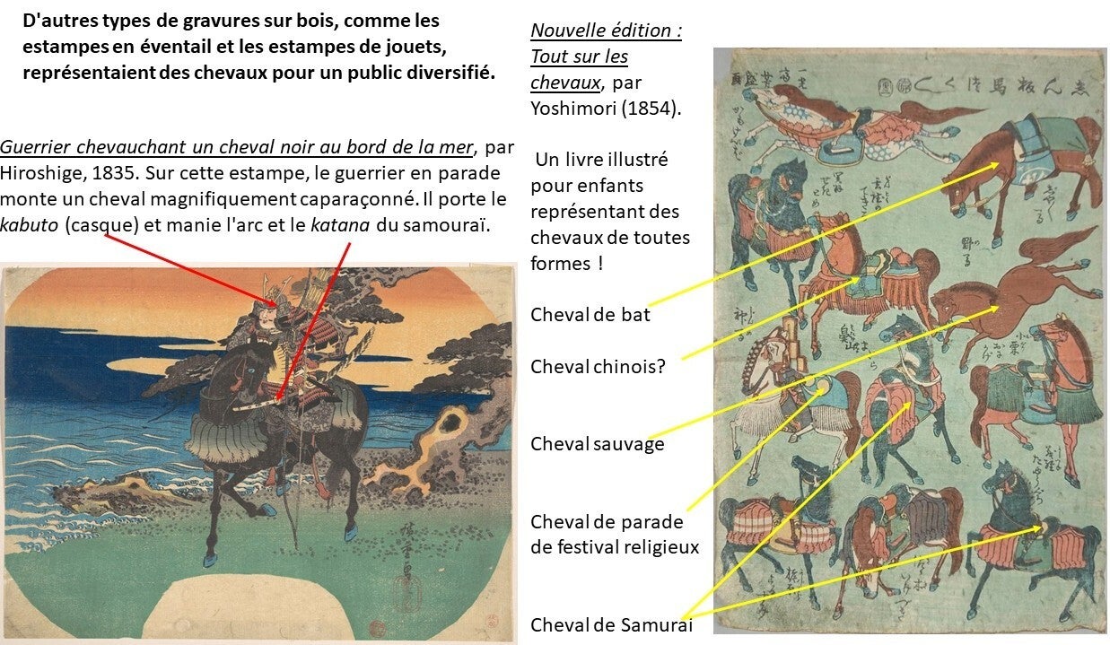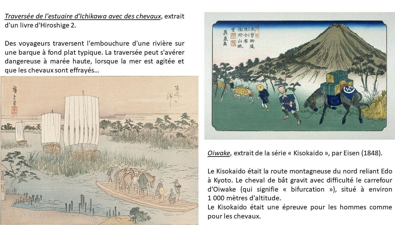 Comme en Europe à la même époque, le XIXe siècle au Japon a vu l'apogée de la présence équine dans tous les aspects de la société : agriculture, transports, armée et divertissement. Cette présence se reflète dans la variété des estampes produites. Dans cet article, vous aurez sans doute remarqué l'omniprésence des chevaux dans la série du Tokaido, où ils servent de montures pour le transport de personnes et de marchandises.