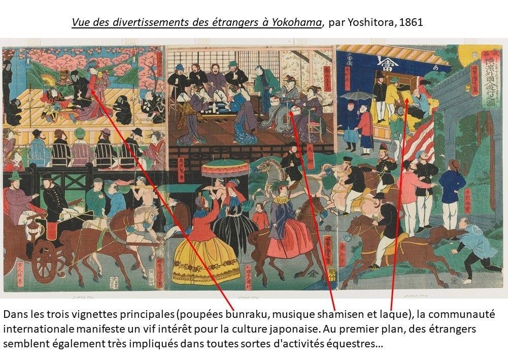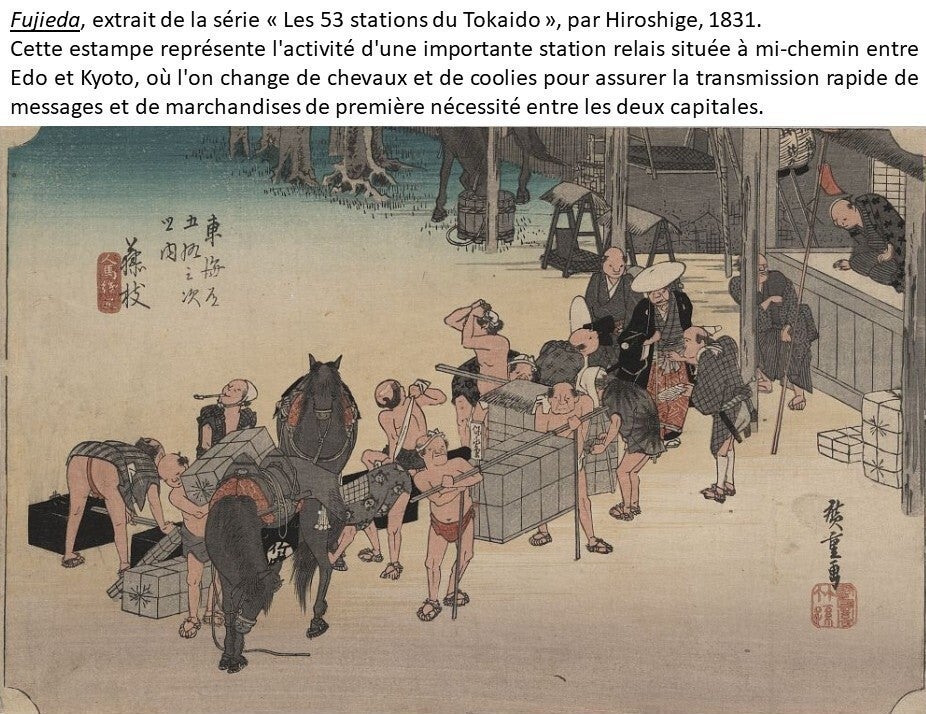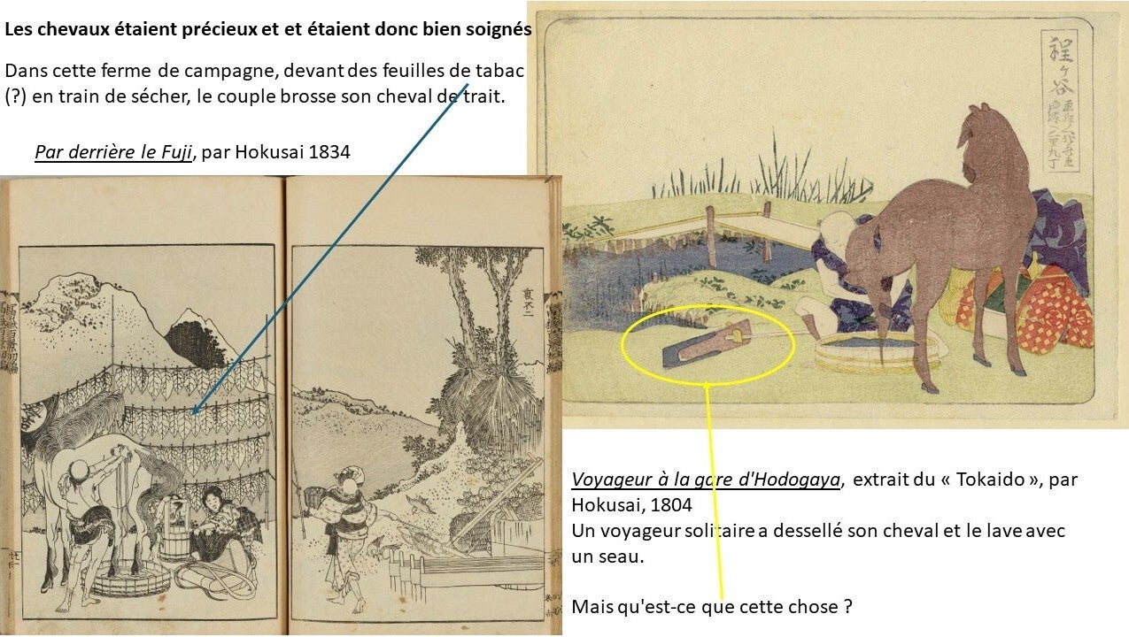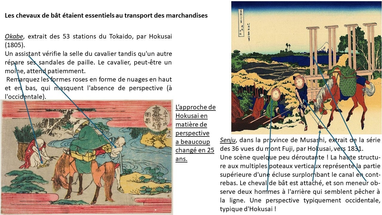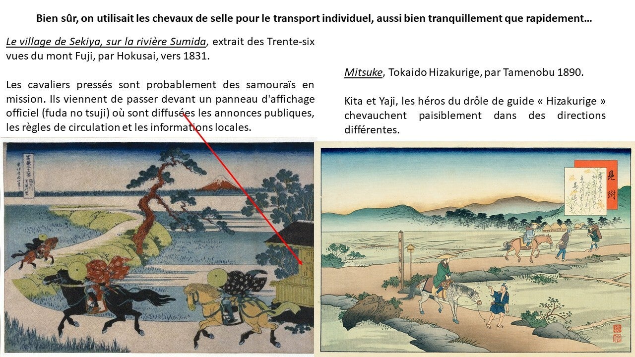 Comme en Europe à la même époque, le XIXe siècle au Japon a vu l'apogée de la présence équine dans tous les aspects de la société : agriculture, transports, armée et divertissement. Cette présence se reflète dans la variété des estampes produites. Dans cet article, vous aurez sans doute remarqué l'omniprésence des chevaux dans la série du Tokaido, où ils servent de montures pour le transport de personnes et de marchandises.