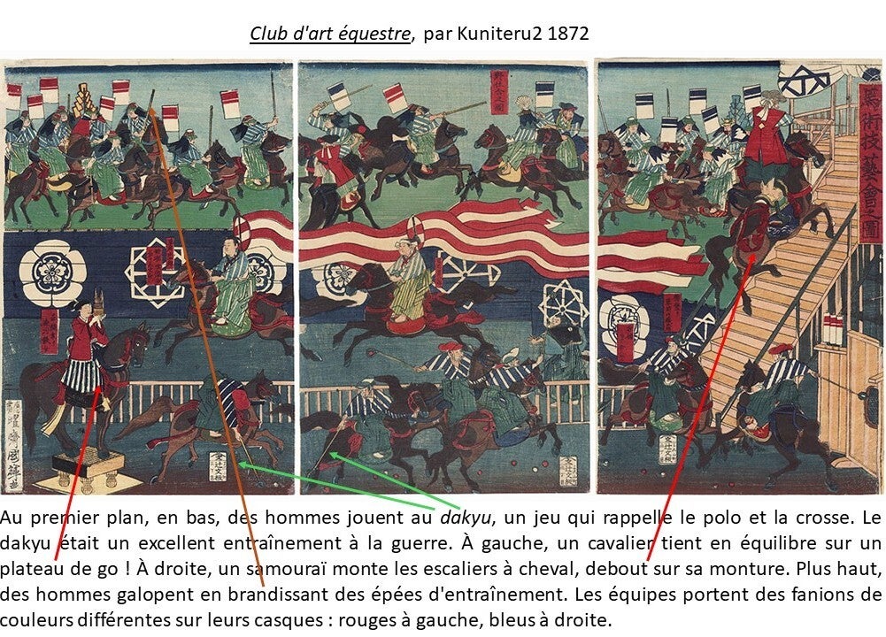 Les chevaux sont présents au Japon depuis le Ve siècle. Originaires de Corée et de Chine, ils furent rapidement adoptés. Pendant plus de mille ans, ils furent montés par les samouraïs, et leur introduction révolutionna l'art de la guerre. Mais les chevaux jouèrent également un rôle déterminant dans la transformation des structures politiques et l'influence des traditions culturelles et agricoles. Il n'est donc pas surprenant de les retrouver fréquemment dans les estampes japonaises. Suite à la révolution Meiji en 1868 et à la fin de la société des samouraïs, les chevaux de samouraïs ont disparu du Japon. Cependant, comme vous le découvrirez dans cet article, une autre activité équestre a pris le relais.