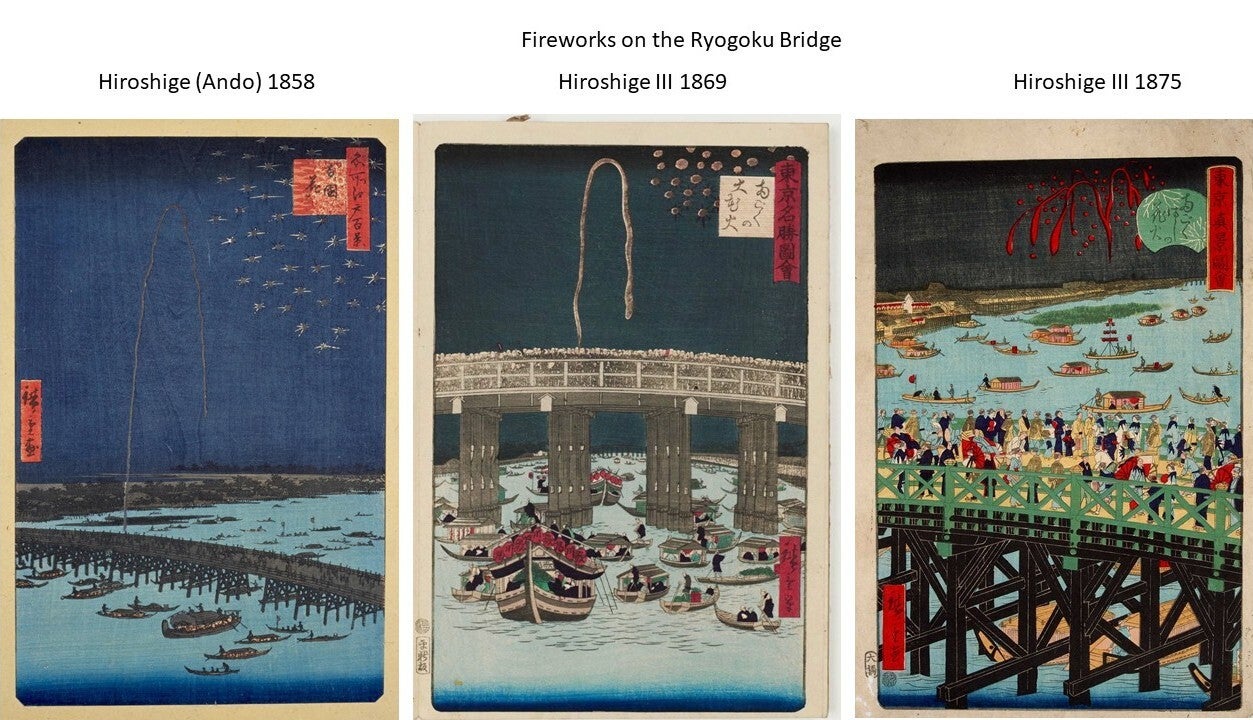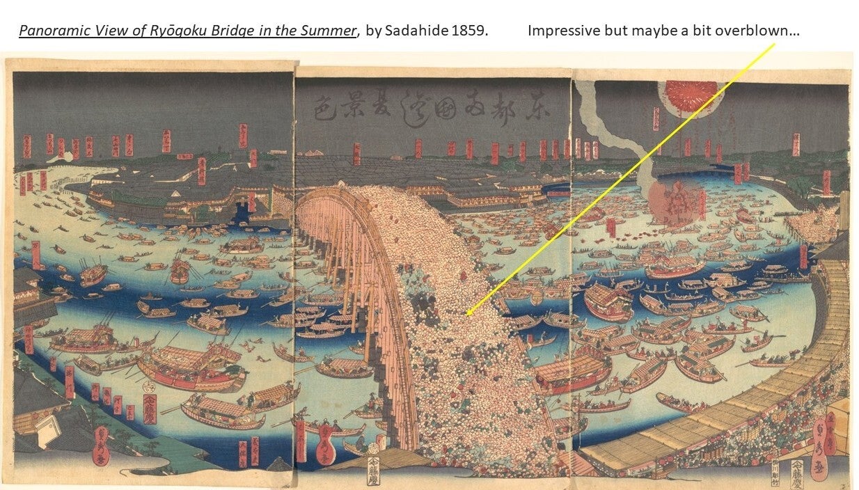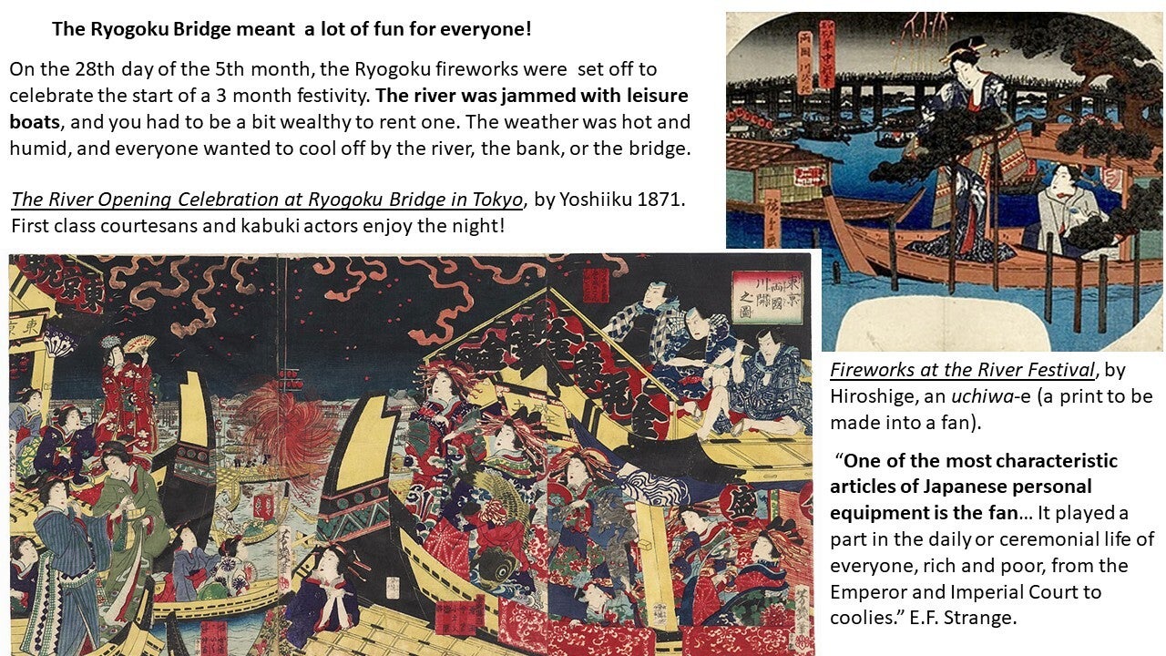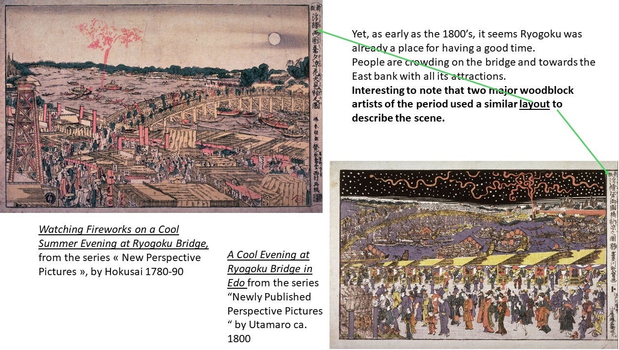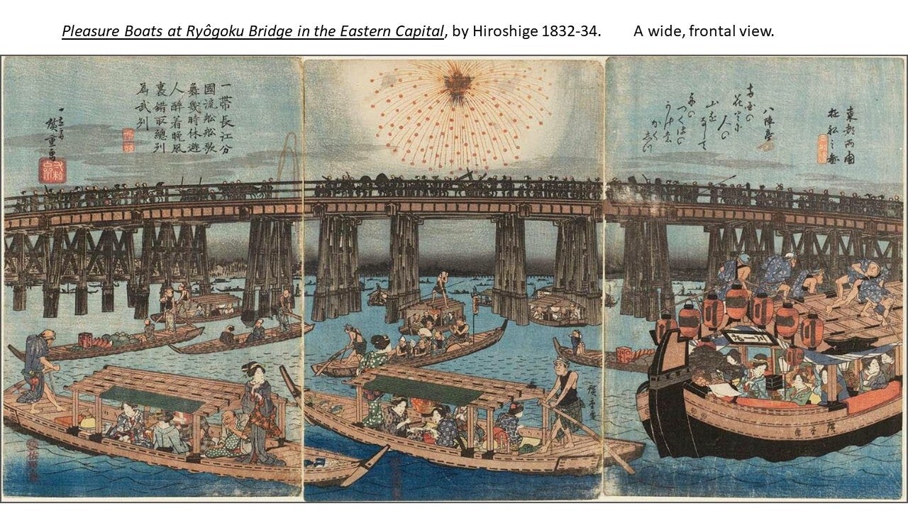 The great Hiroshige described the Ryōgoku Bridge in the 19th century as "the liveliest place in the Eastern Capital, with side-shows, theaters, story-tellers, and summer fireworks; day and night, the amusements never cease.“